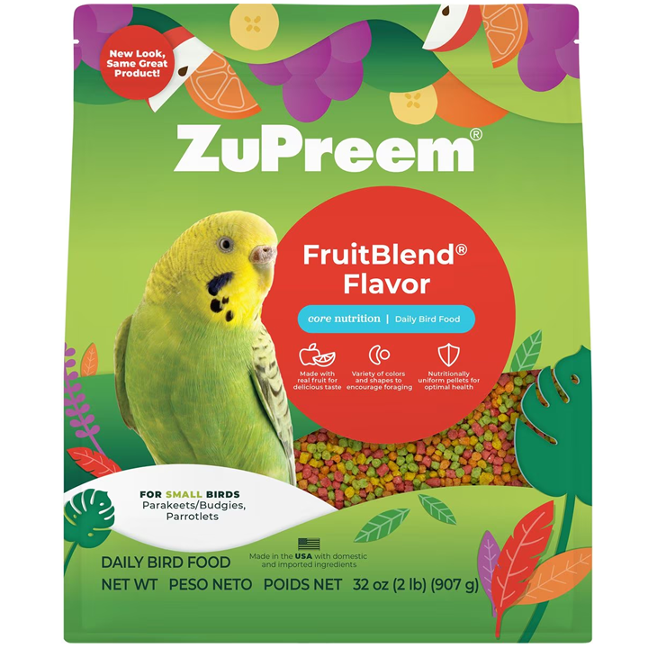ZuPreem® FruitBlend Flavor Premium Bird Food is formulated for various species of adult psittacines (hookbills) and passerines (softbills). Made from fresh ground fruit for a taste and aroma birds love. Nutritionally balanced and available in various pellet sizesThis pellet is the appropriate size for parakeets and  other similarly sized birds.