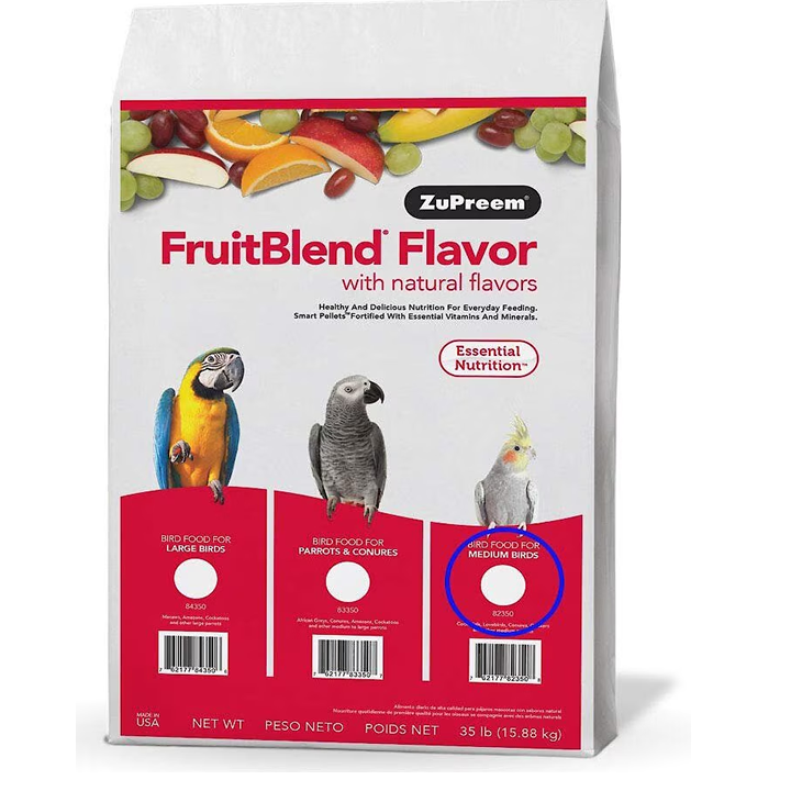 ZuPreem® FruitBlend Flavor Premium Bird Food is formulated for various species of adult psittacines (hookbills) and passerines (softbills). Made from fresh ground fruit for a taste and aroma birds love. Nutritionally balanced and available in various pellet sizesThis pellet is the appropriate size for cockatiels and  other similarly sized birds.