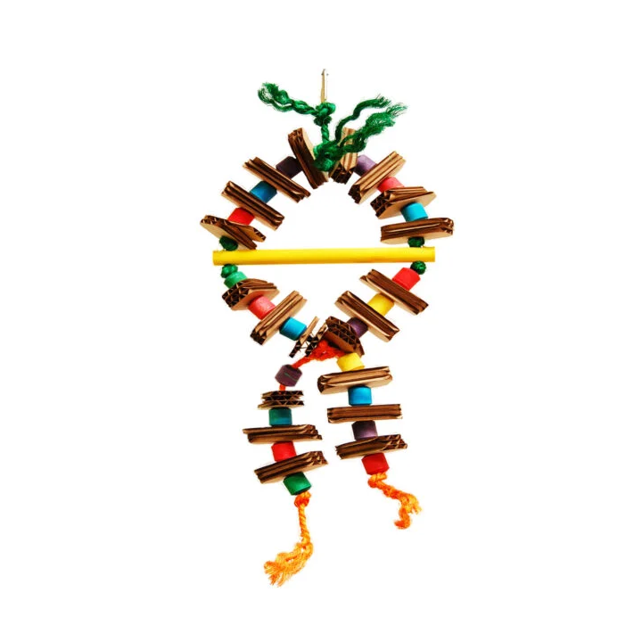 This Coronet Shred-x medium size bird toy is made of cardboard slices and wood pine, with sisal rope, fun for shredding and fun for swinging. Recommended for small to medium birds.