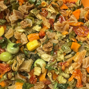 Chock full of garden goodness, this food is a great mix of yummy veggies, including green and red bell peppers, zucchini, broccoli, peas, tomatoes, celery, potatoes, spinach and corn. Easy to make and lasts up to 5 days in the refrigerator