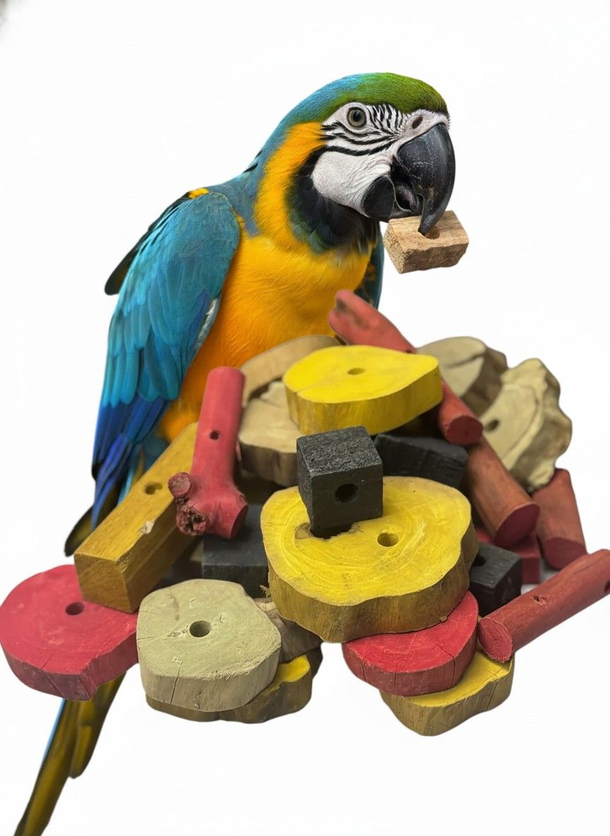 Discover our Java Wood Grab Bag! A 2-pound assortment of natural wood pieces perfect for birds who love to chew, shred, and destroy. Each bag contains a variety of sizes and shapes to keep your feathered friend entertained for hours. The natural wood tones may appear muted, but that's part of their charm. Use them as-is for authentic foraging enrichment, or refresh them with bird-safe dyes to add vibrant color to your bird's cage. These durable pieces are ideal for heavy chewers and destructive birds who go through toys like termites through wood. Java wood is a popular choice for parrots, macaws, and other large birds seeking natural, splinter-free chewing material. Rotate pieces regularly to maintain interest and encourage natural behaviors.