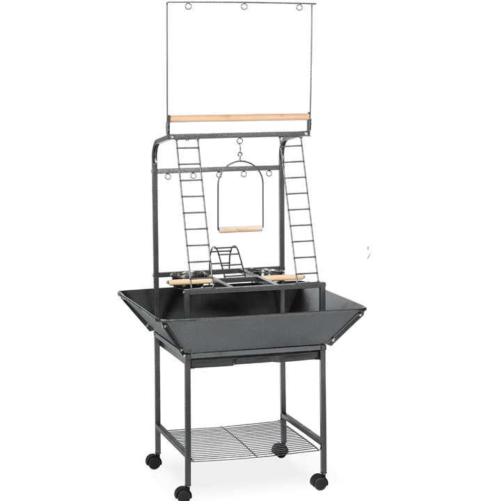 Double cups provide room for food, water and treats, and the easy-rolling caster stand lets you easily move the playstand from room to room or indoors to outdoors. A pull-out tray, along with the rounded corner seed guard, make cleaning quick and easy, while the bottom storage shelf is perfect for keeping extra food, treats, toys and cleaning supplies. The Small Parrot Playstand measures 17-5/8" long, 16-1/2" wide and 59" high to the top of the toy hook.