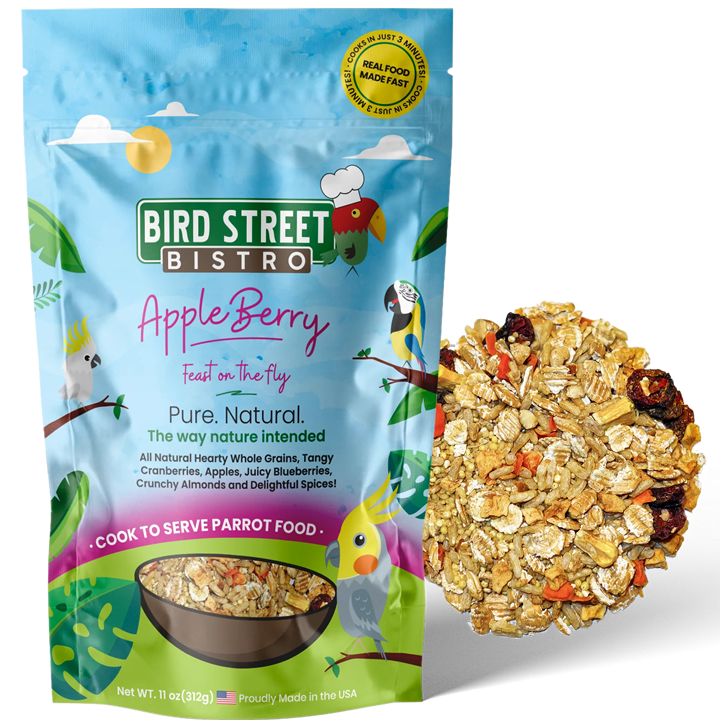 Fresh-picked produce is the best healthy food for birds! With Bird Street Bistro, your parrot can enjoy healthy ingredients and rich flavors, just like in the wild. Made with a wide mix of wholesome foods and flavors, Bird Street Bistro's Apple Berry also encourages foraging instincts! Every batch contains 100% natural ingredients and no preservatives, fillers, or artificial extras, so you never have to wonder what to feed your parrot. Easily bring the dried blend to life by boiling the dry ingredients in just 3 minutes. Naturally sweet apples, cranberries, blueberries, and carrots are lightly seasoned with Ceylon cinnamon, which offers both heart health benefits and delicious flavors parrots love. All-natural recipe Natural source of immune-boosting vitamins