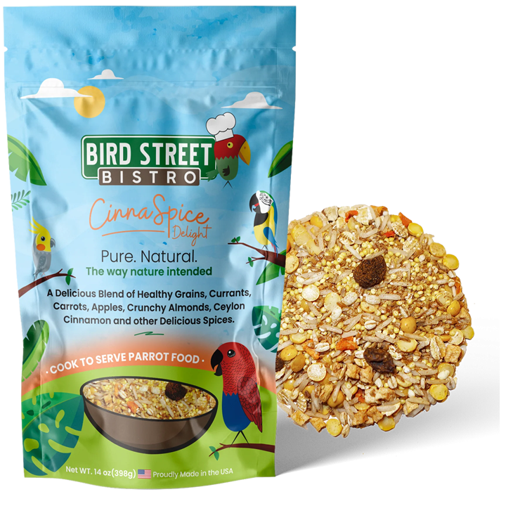 Wondering what to feed your parrot? Start with all-natural ingredients and flavors they love! The CinnaSpice Delight is thoughtfully crafted with nutrition in mind. Like all Bird Street Bistro products, it's made without fillers, additives, sugar, salt, or artificial ingredients. Every bite is packed with healthy grains, fruits, and vegetables rich in protein, fiber, and vitamins. The dried blend cooks in just 15 minutes, filling your home with the vibrant scent of coconut, cinnamon, apple, and sweet-spicy anise seed. Ready to serve after five minutes of cooling. Encourage your bird's wild foraging instincts with flavorful, bite-sized ingredients and crunchy almonds that add textural variety. 100% all-natural with no preservatives, rich in fiber for digestive health, and freezes for up to a week of convenient meals.